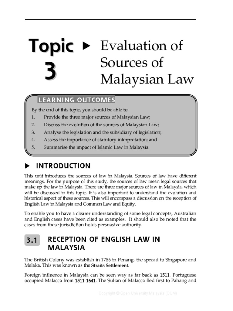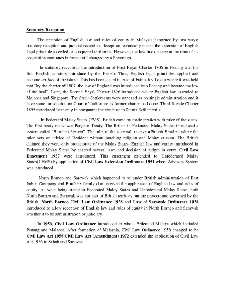 Manner of receiving english law in present day malaysia english law has been received in malaysia both, a.