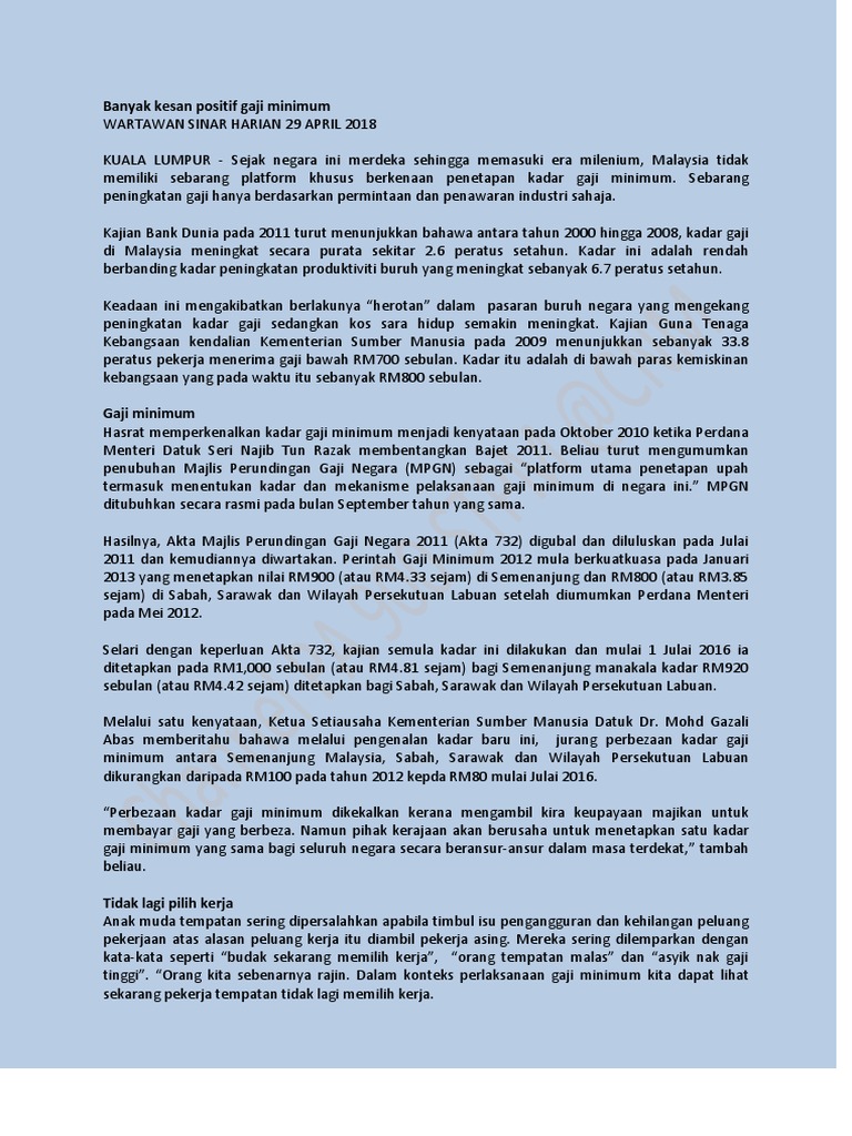 {b) gaji yang distruktur semula hendaklah tidak kurang baiknyadaripadagaji. Apakah anda mengetahui apa saja yang termasuk dalam komponen upah? Ini selaras dengan pelaksanaan perintah gaji minimum 2016 yang memperuntukkan kadar gaji minimum sebanyak rm1,000 sebulan bagi semenanjung dan rm920 sebulan bagi sabah, sarawak dan wilayah. We are a sharing community. Perintah gaji minimum 2016 iaitu rm1,000 sebulan bagi semenanjung sebanyak 100 majikan di seluruh negara bakal dikenakan tindakan tegas jika didapati masih gagal mematuhi pelaksanaan perintah gaji minimum 2012. Tahun 2012 2016 2018 2020. Rundingan penstrukturan semula gaji mengikut perenggan 6 perintah gaji minimum 2012 majikan dan pekerja, atau kesatuan sekerja boleh merundingkan penstrukturan semula gaji di bawah seksyen 7b akta kerja 1955. Tarikh kuat kuasa perintah gaji minimum baru mulai 1 jan 2020 ke atas semua majikan dan perintah tersebut akan diwartakan dalam masa terdekat. Minimum wages order (amendment) 2018. For this magazine there is no download available. Dasar gaji minimum membantu meningkatkan gaji selaras dengan kos sara hidup, seterusnya membolehkan pekerja memenuhi keperluan asas seperti makanan, tempat tinggal dan pakaian. Perintah gaji minimum 2012 minimum wages order 2012. So please help us by uploading 1 new document or like us to download